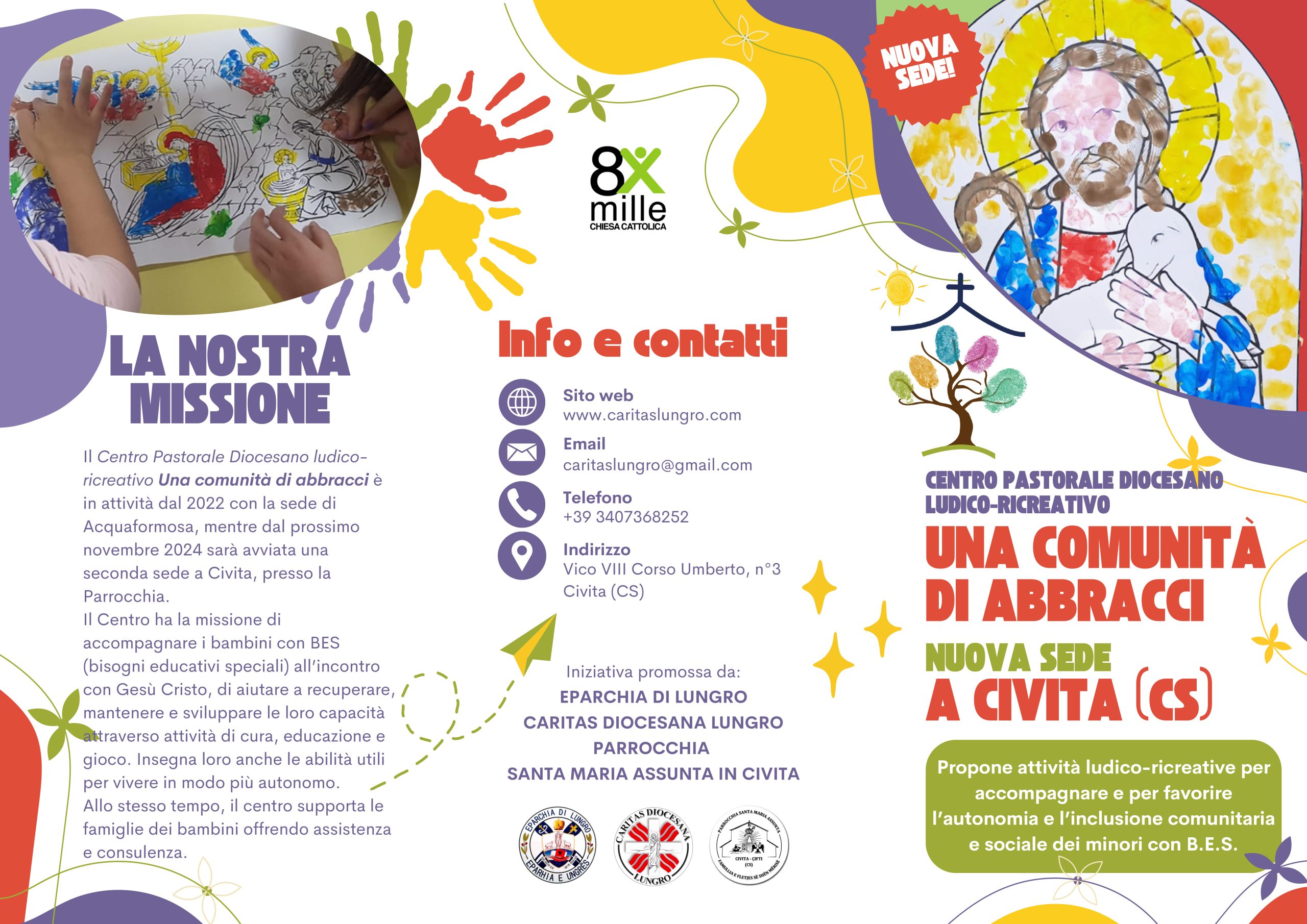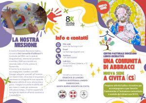 Il Centro Pastorale Diocesano ludico-ricreativo Una comunità di abbracci è in attività dal 2022 con la sede di Acquaformosa, mentre dal prossimo Novembre 2024 sarà avviata una seconda sede a Civita (Cs), presso la Parrocchia Santa Maria Assunta.