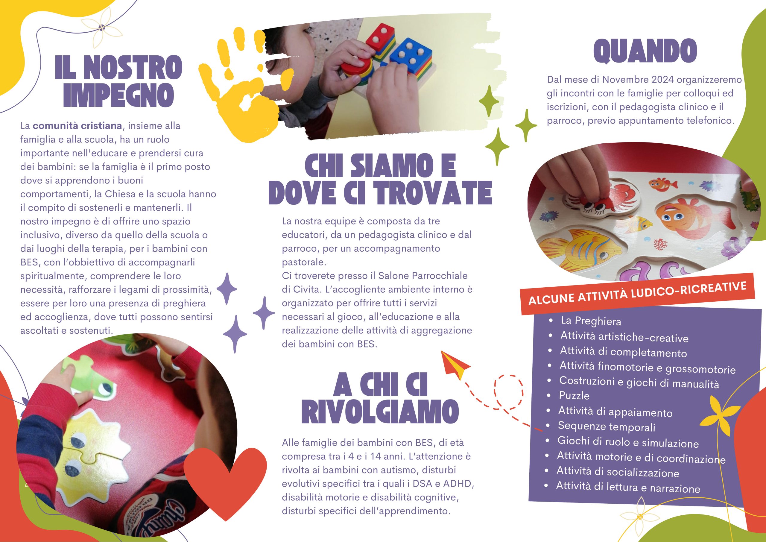 Il Centro ha la missione di accompagnare i bambini con BES (bisogni educativi speciali) all’incontro con Gesù Cristo, di aiutare a recuperare, mantenere e sviluppare le loro capacità attraverso attività di cura, educazione e gioco. Insegna loro anche le abilità utili per vivere in modo più autonomo. Allo stesso tempo, il centro supporta le famiglie dei bambini offrendo assistenza e consulenza.